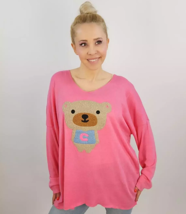 Pulover subțire supradimensionat cu decolteu în V, cu ursuleț de pluș