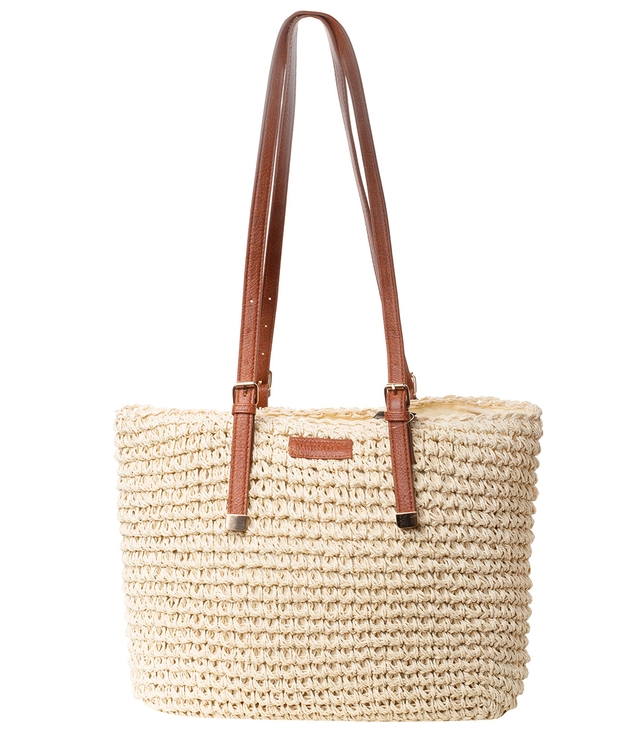 Geantă mare dreptunghiulară de plajă din paie cu mânere din piele ecologică