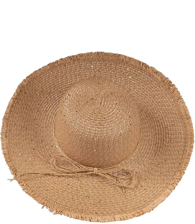 Pălărie mare de damă din rafie cu pandantive șiruri boho